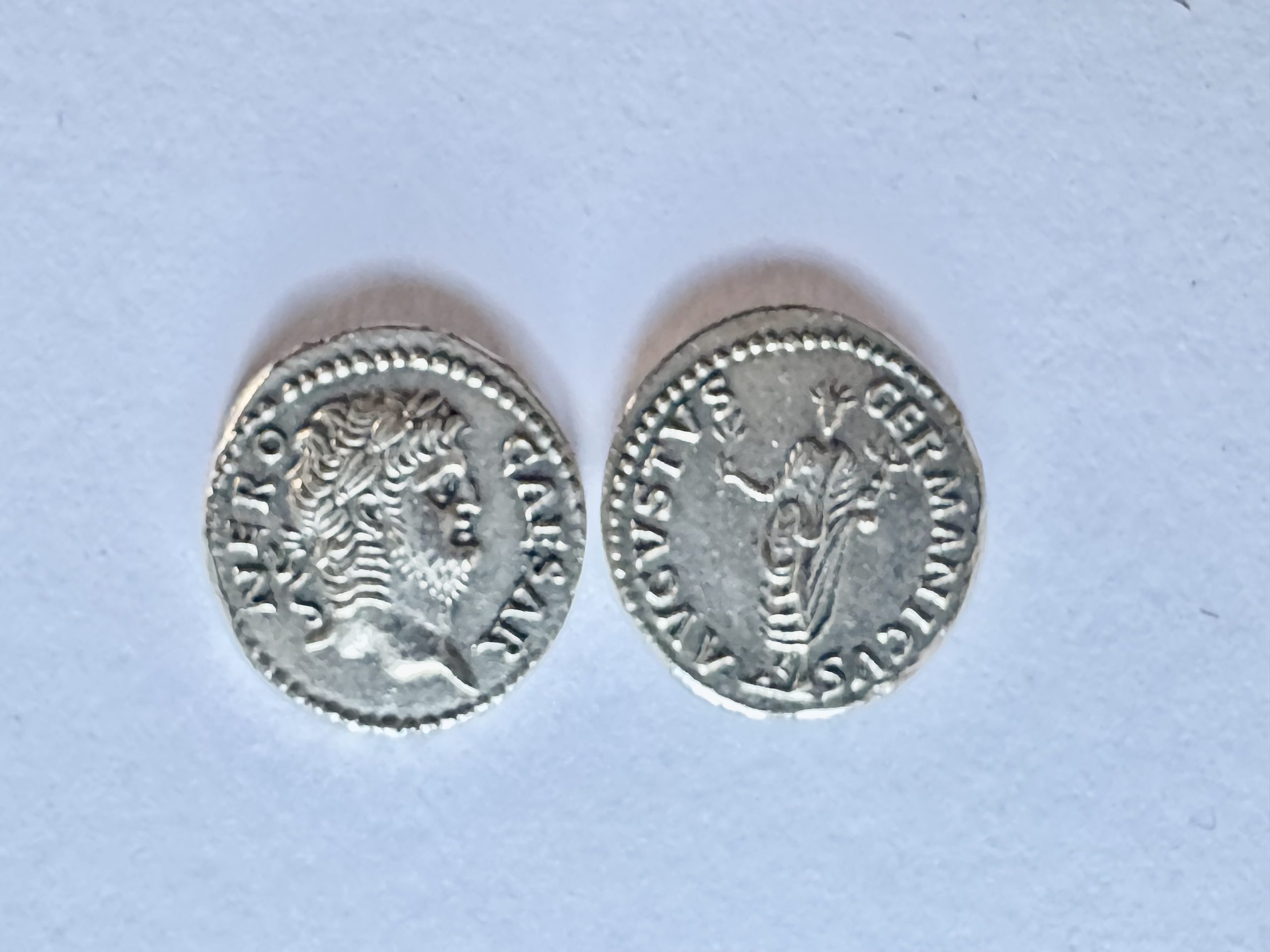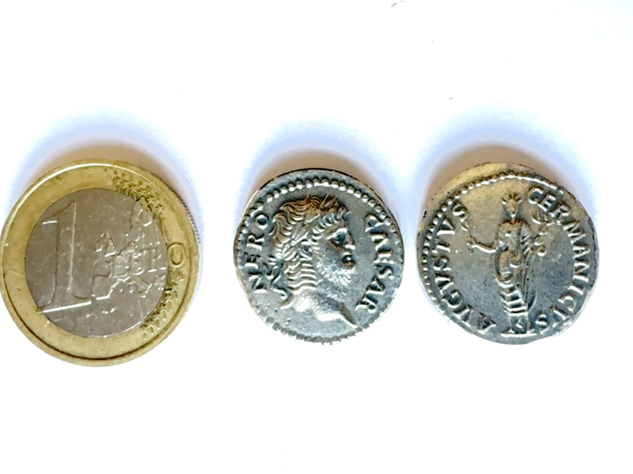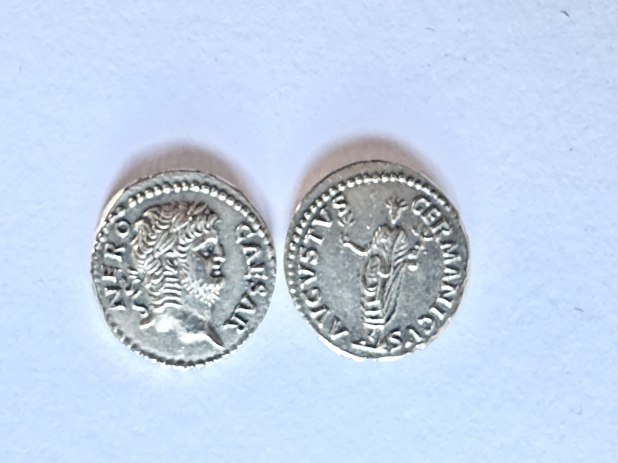 Reproducción de un denario con el busto de Nerón en el anverso y Nerón de pie el reverso. (VER DESCRIPCIÓN).